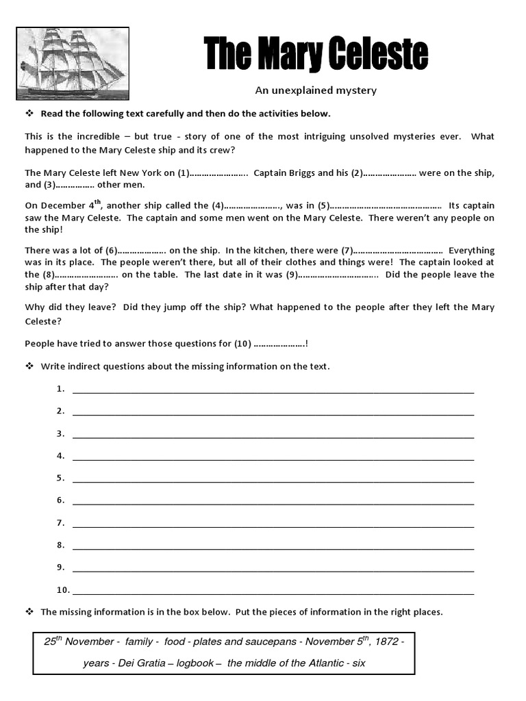 October 9 2022 by guest The Mystery Of The Mary Celeste Comprehension Pdf Right here we. 46 47 The Mystery of the Mary Celeste The evidence Two hatches were open. The case of the Mary Celeste.